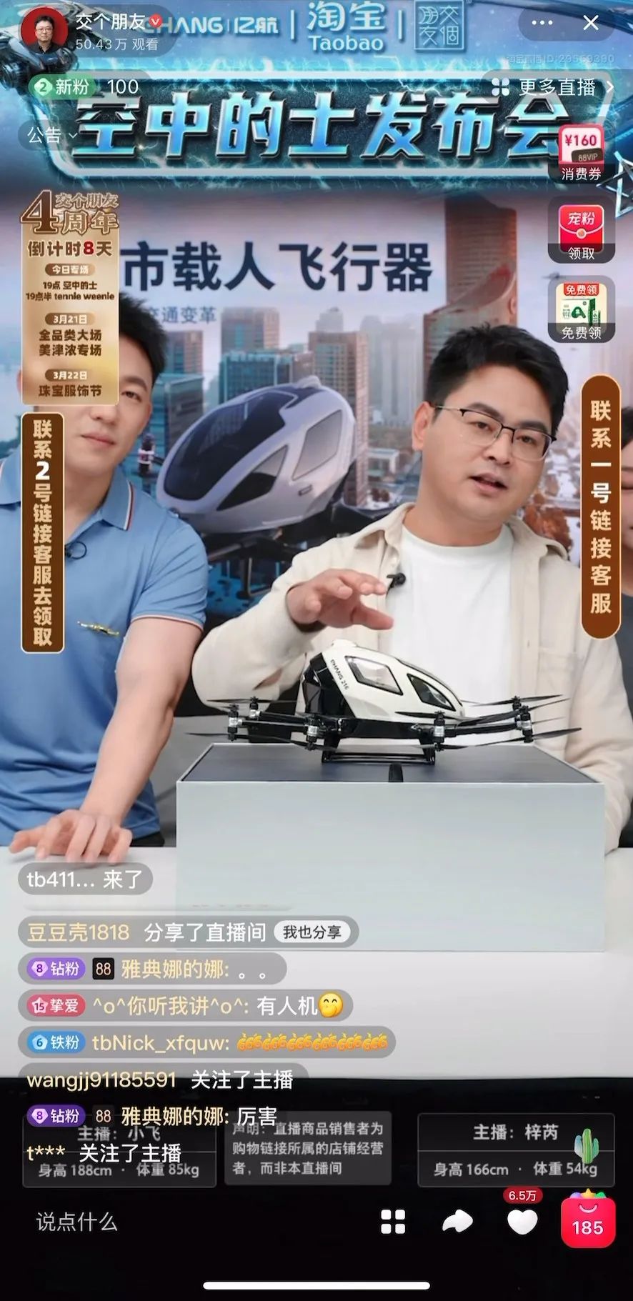 “交个朋友”淘宝直播间科普“空中的士”的应用场景
