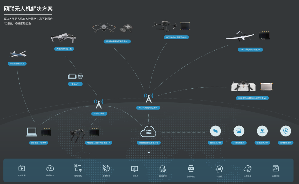 天宇经纬是国内首批专注于低空智联网技术研发企业,已与上百家无人机、机器人、行业负载、软件厂商完成合作适配,以实现泛低空万物互联、多行业、全链接能力,这些合作不仅仅局限在纯软件、数据接口方面,而是软硬件深度结合、协议匹配的工业级物联网模式。通过与众多友商的合作,构建了一个完善的低空智联5G融合应用生态,“云盒+御空”的内核,形成了四通八达、承上启下的中枢神经,并通过归一化API接口将所有网罗的多厂商、多型号产品和能力面向集成商统一输出,并保持标准化、兼容化,将复杂问题简单化,对二次开发极度友好。