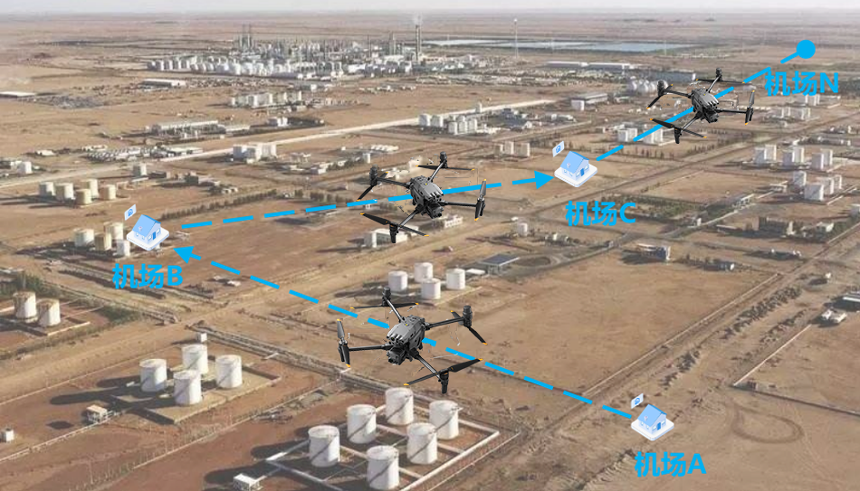 机场进行网格化部署后,无人机就像车辆,车辆没油找加油站,无人机没电就找机场充换电解决续航问题,就像任何车都可以去任意加油站一样,不再有无人机与机场的绑定局限,同型号设备可以随意组合、跳转。