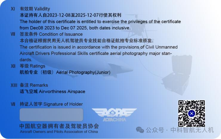 为完成培训学时并考核合格的人员,颁发《民用无人机驾驶员专业技能合格证(航拍驾驶员)》。