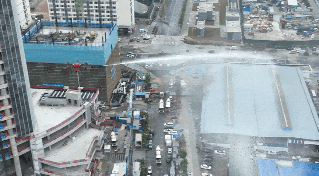 在作业阶段,此次测试灭火高度100米,现场风力较大且伴随中小雨,TS-X12型系留无人机挂载专用喷射装置携水带迅速升空至测试位置,随后完成了2分50秒持续喷射灭火作业测试,水压为0.93MPA,混合液流量为133L/min(等效CAF流量为800/min),水平喷射距离达26米,喷射路径良好,飞行姿态稳定。