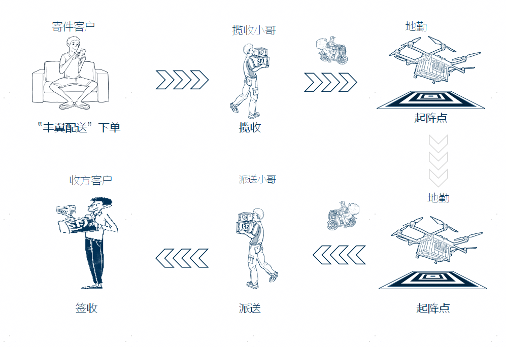 与普通快递类似,丰翼无人机快递运输流程如下: