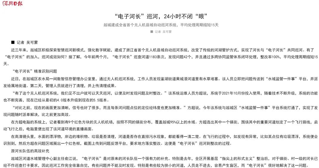 近三年来,越城区积极探索智慧巡河新模式,强化数字赋能,建成了浙江省首个无人机县域自动巡河系统,改变了传统的河湖管护方式,实现了河长与“电子河长”共同巡河。