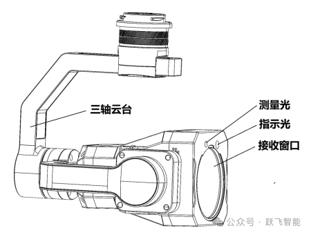探头外部由三轴云台、测量激光孔、指示激光孔和接收窗口组成,具体位置见下图。