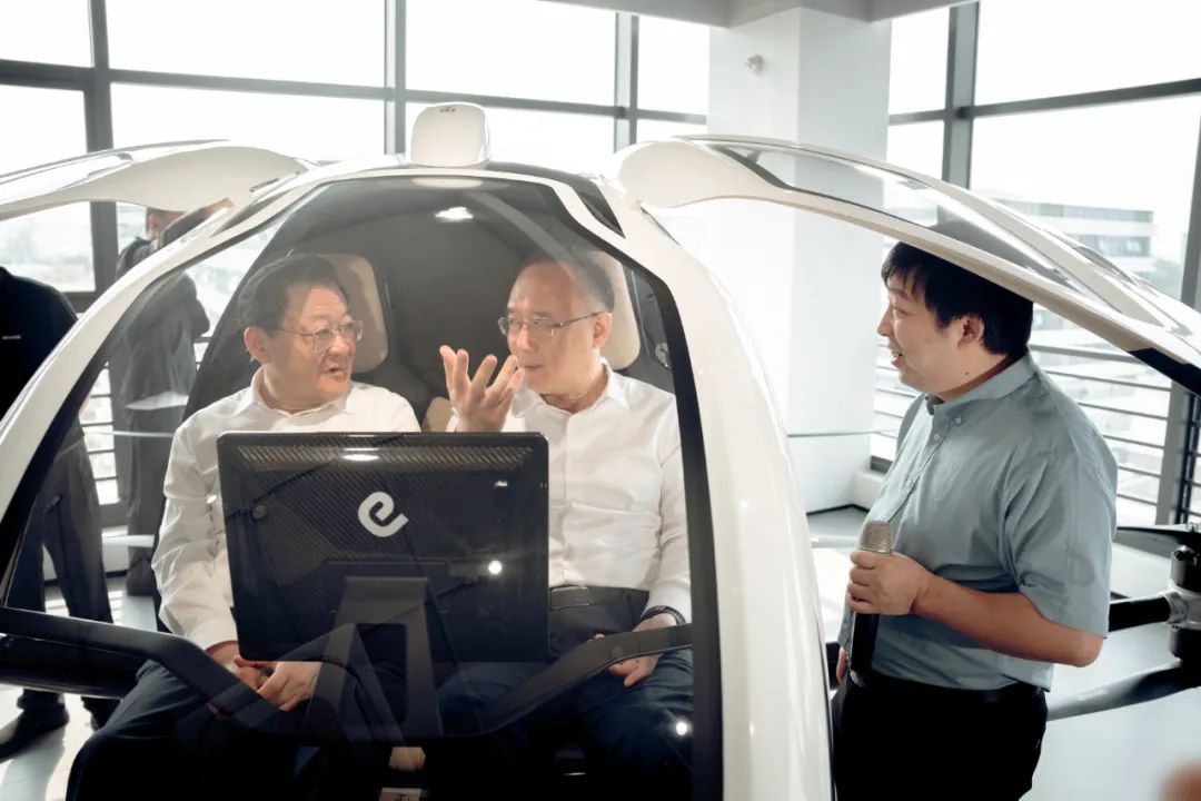 广东省省长王伟中、山西省省长金湘军在胡华智陪同下试乘亿航智能自主研发的全球首个获得适航三证的EH216-S无人驾驶载人航空器