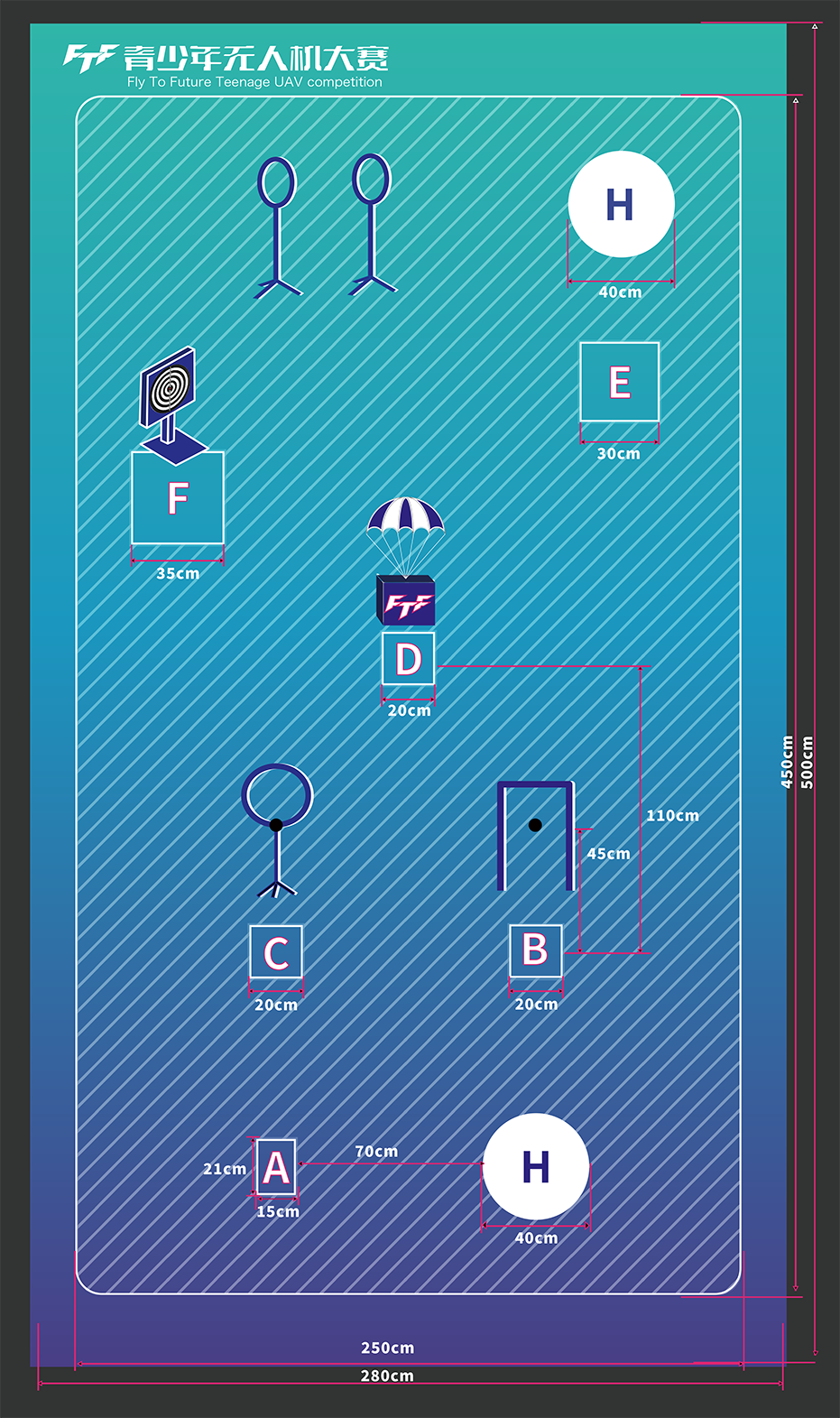 无人机由H2区域起飞—穿越障碍物—到达打靶区射击—补给站补给(在补给站成功补给1次,获得额外得分)—多次打靶(每射击1次需穿越障碍物,直接射击无法获得穿越障碍物得分);