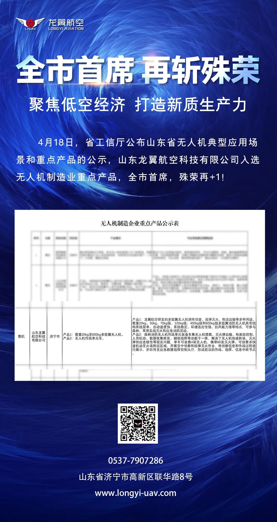 4月18日,省工信厅公布山东省无人机典型应用场景和重点产品的公示,山东龙翼航空科技有限公司入选无人机制造业重点产品,全市唯一。