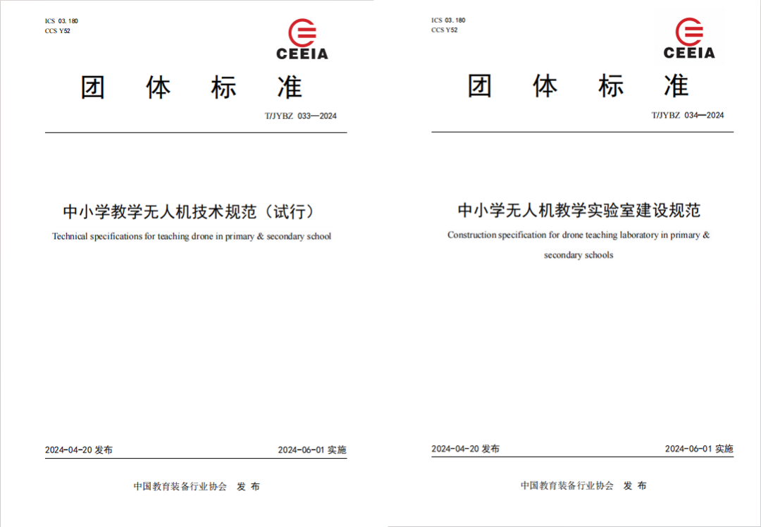 为促进中小学教学无人机技术和科普实验室建设的有序发展,依据《中国教育装备行业团体标准管理规定》的有关规定,经评审,中国教育装备行业协会批准《中小学教学无人机技术规范(试行)》和《中小学无人机教学实验室建设规范》两项团体标准,现予以发布。