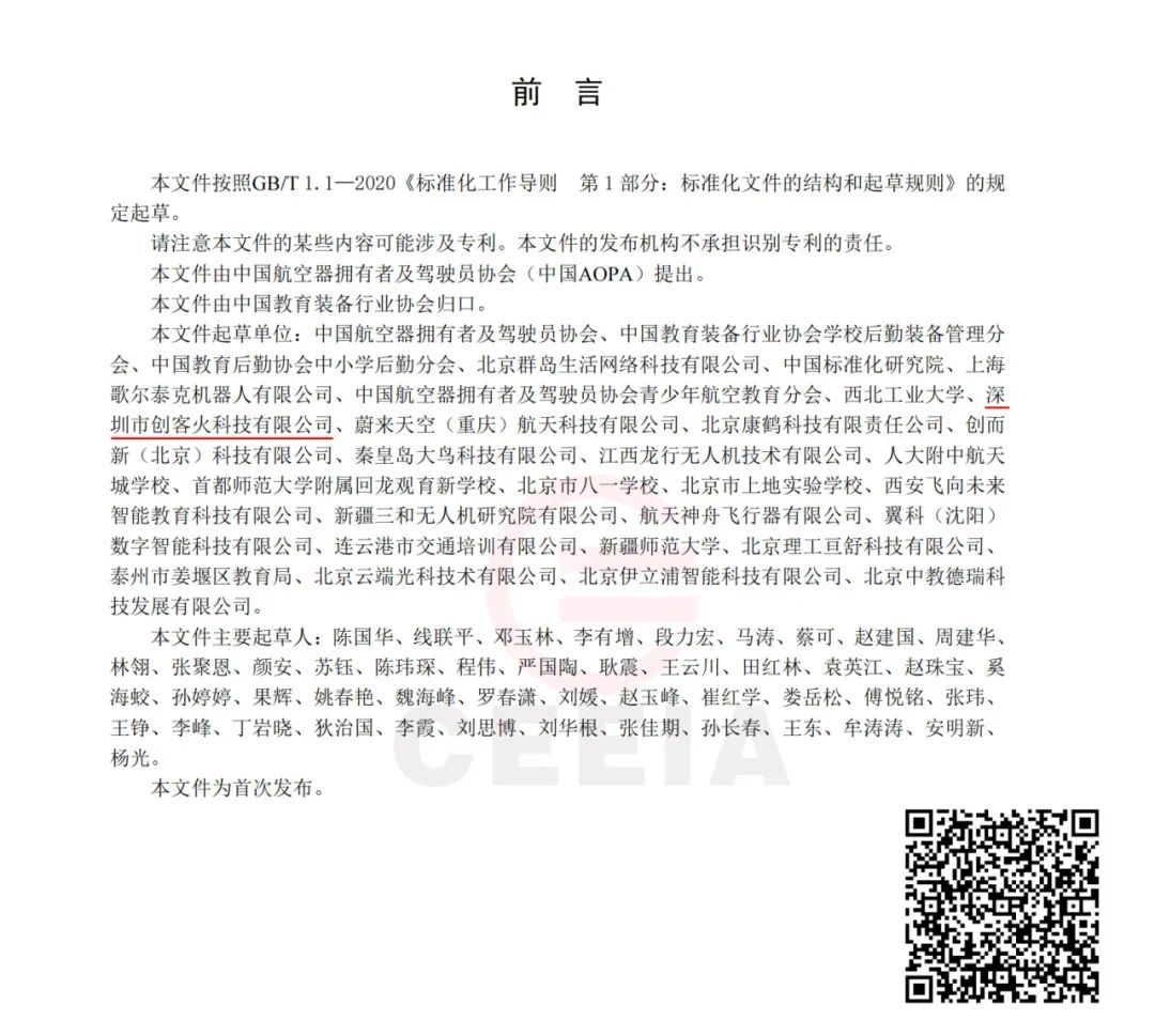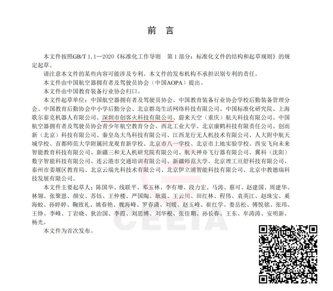 创客火从前期立项、起草、研讨,中期编制、征求到最终定稿,全程参与制定的《中小学教育无人机技规范(试行)》及《中小学无人机教学实验室建设规范》团体标准已于2024年4月20日正式发布!