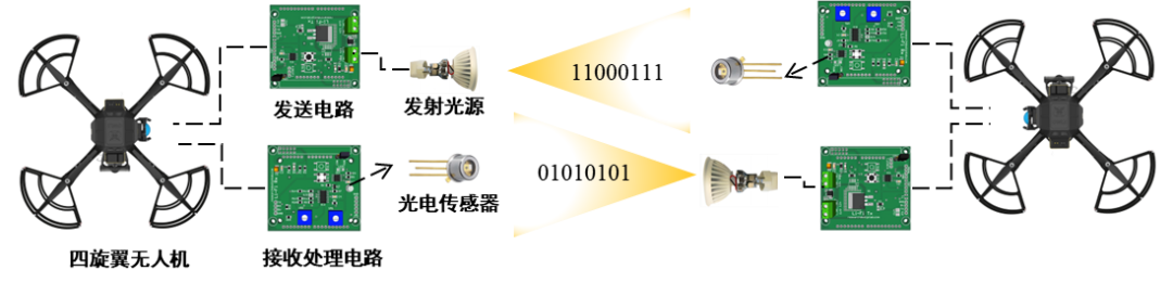 ——为了克服环境光照对光通信链路性能的影响,研究团队采用了紫外/可见双通道LED光源,并提出了一种高冗余纠错编码技术,使通信光源更容易与环境光源区分,提升了无人机间信息传递的可靠性。