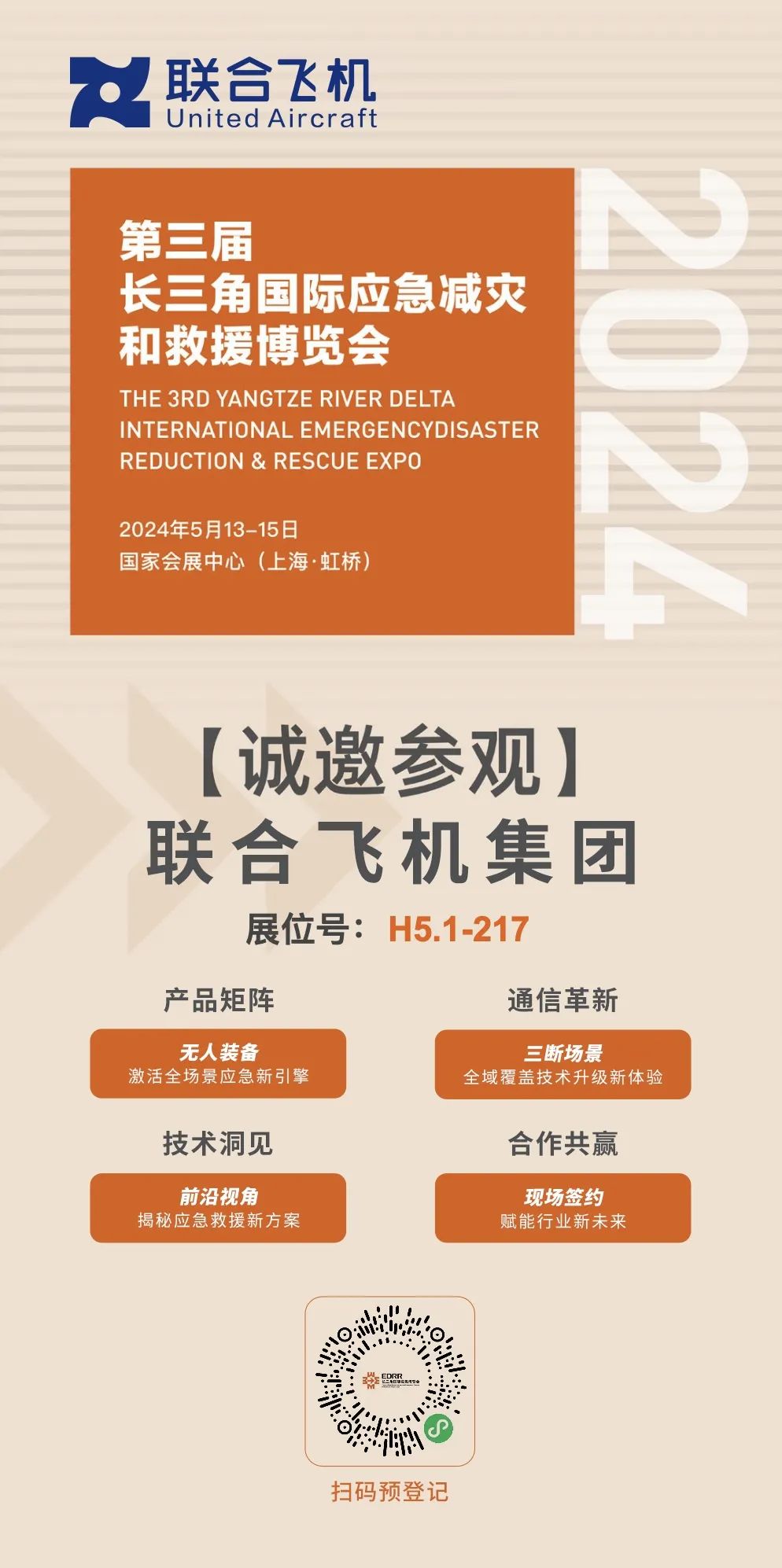 5月13日-15日,第三届长三角国际应急减灾和救援博览会如约而至!届时联合飞机将集中展示应急通信、城市消防灭火、森林防火灭火、物资运投、灾情侦察等应急救援领域的重磅产品与创新方案,带来多个典型环境下飞行演示与应用的经验,以及路演、论坛演讲、行业解决方案发布会等多场主题活动,期待您的莅临!