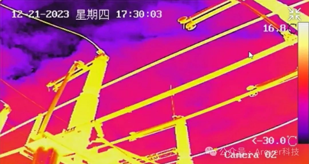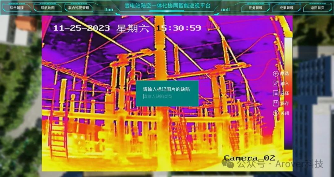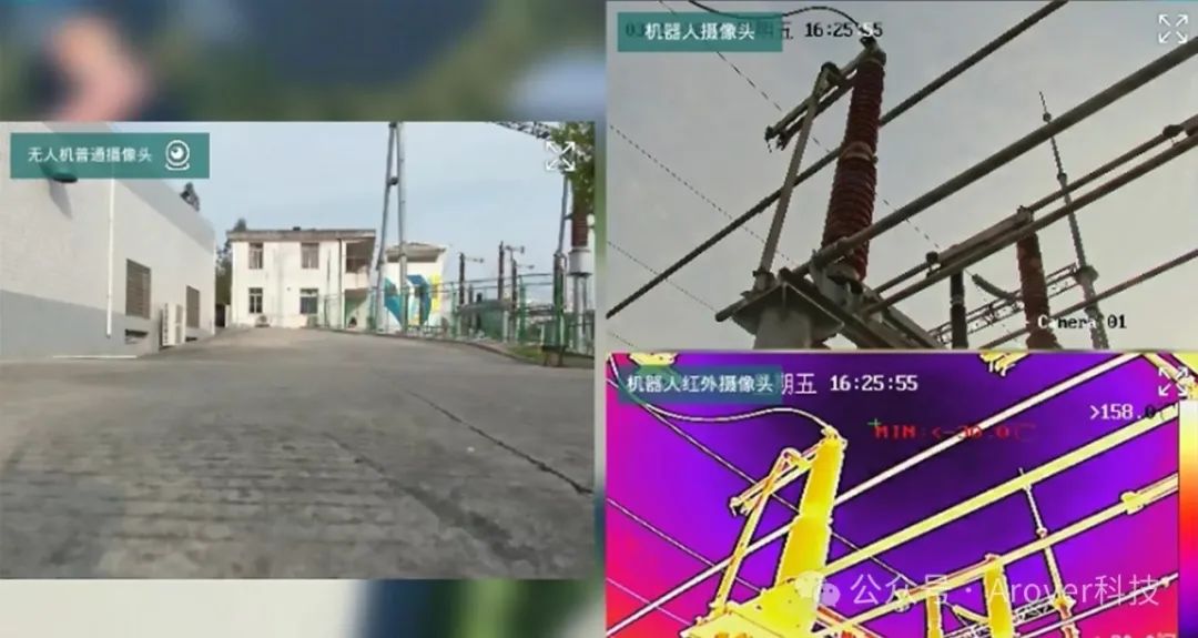 协同巡检监控无人机、四足机器人现场巡检画面,支持可见光/红外视角切换、同屏显示;实时检测站内设备温度变化,显示温度最高点区域及温度值,并对异常温度进行告警。