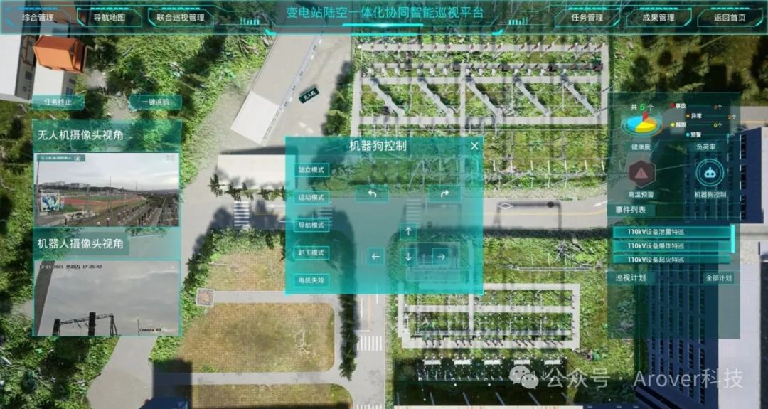 “无人机+四足机器人”陆空一体变电站巡检平台严格遵循《变电站无人机巡检技术规范》、《变电站智能机器人巡检系统技术规范》等标准,利用“无人机+四足机器人”联合智能巡检,构建以无人机、四足机器人为核心的立体巡检体系,全面监测设备运行情况;具备巡检点位部署、巡检路径验证、协同巡检监控,巡检任务干预,巡检成果管理等功能,打造智能联动、智能巡检、智能操作、智能管理的联合巡检平台。