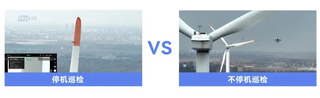 风机不停机巡检则是在停机巡检的基础上,无人机在风机叶片运行过程中自主作业的巡检方式,解决了风机因反复启停而增加的发电量损失的问题。