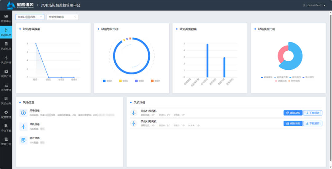 巡检结束并一键自动生成报告之后,星逻御风平台将风机出现的缺陷类型、等级、维修建议进行集中整合,方便用户根据具体建议进行运维安排,降低运维难度,节约运维时间,提高整体效率。