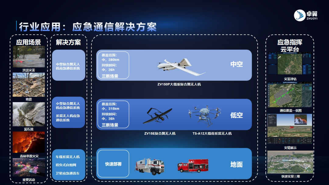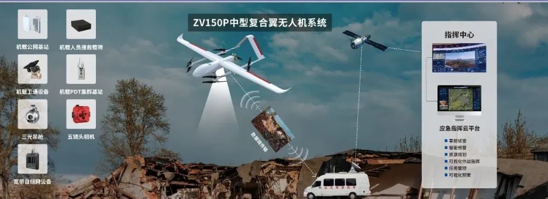 在此种情况下,卓翼依托自身在无人机领域及应急救援领域的技术与资源优势,自主研制出复合翼无人机平台——ZV150P。当出现特大自然灾害或者突发事件时,ZV150P复合翼无人机平台搭载光电吊舱、快速三维建模载荷、机载卫通设备、机载PDT基站、机载宽带自组网设备、人员搜救载荷、机载公网基站等载荷,采用卫星通信、机载中继等测控数据传输链路,能够执行应急指挥通信、灾情实时侦察、快速三维建模、人员搜索定位等任务,满足地震、洪涝、森林火灾等多种自然灾害航空应急救援需求。