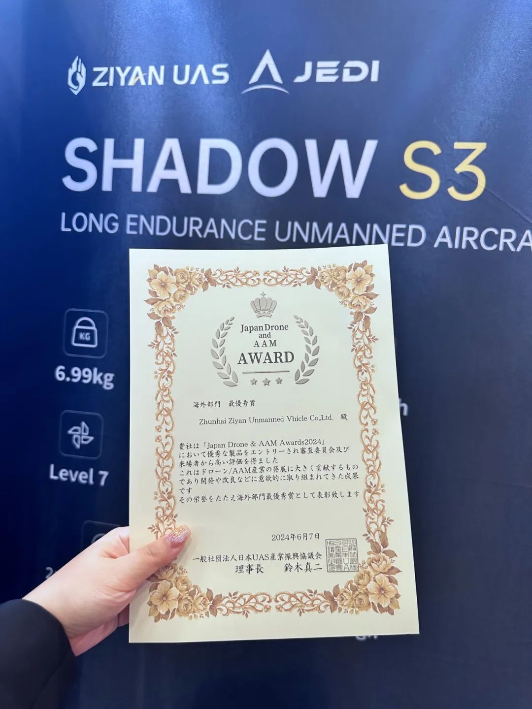 2024年6月5-7日,第九届日本无人机展 Japan Drone 2024在日本千叶幕张国际会展中心举行。作为创新与技术交流的前沿平台,本次展会吸引了来自全球50多个国家和地区的超三万多名专业观众参展;紫燕在本届国际盛会上与众多企业同台竞技,获得了Japan Drone & AAM Awards2024最优秀奖。
