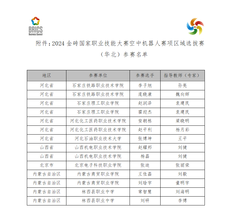 附件:2024金砖国家职业技能大赛空中机器人赛项区域选拔赛(华北)参赛名单
