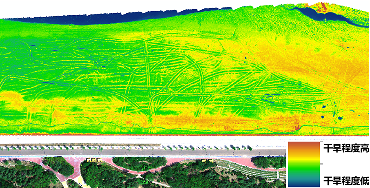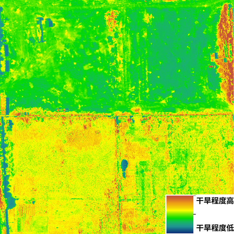 【2】土壤含水量可辅助评估土壤环境与生态质量,测区中包括上部碎石地与下部待耕土地,计算NPDI归一化干旱指数,除去密集植被覆盖区域影响,通过含水量分布可发现碎石地干旱程度较低,待耕土地干旱程度较高,其中待耕土地出现干旱程度不均匀情况,可为灌溉设备布局优化提供指导。