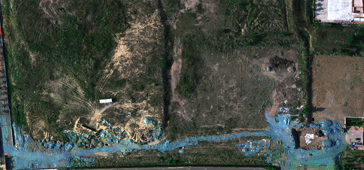 【1】获取某处待建设土地的多源遥感数据,航高100m,其中可见光-近红外多光谱分辨率约5cm,SWIR约10cm,LWIR约10cm,通过可见光影像可发现防尘网破损且覆盖不全的情况。