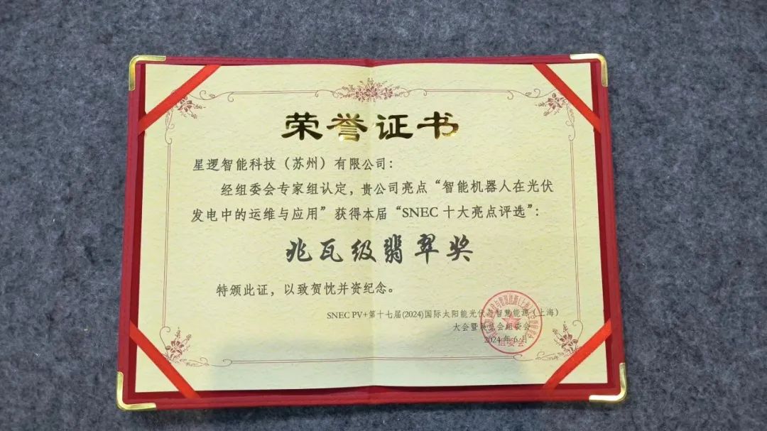 大会上,星逻Lantern光伏清洁机器人荣获“SNEC兆瓦级翡翠奖”。这是星逻智能第二次获得该国际荣誉,高度肯定了星逻Lantern的产品实力和创新能力,也标志着星逻在新能源巡检运维领域持续深耕的无限潜力。