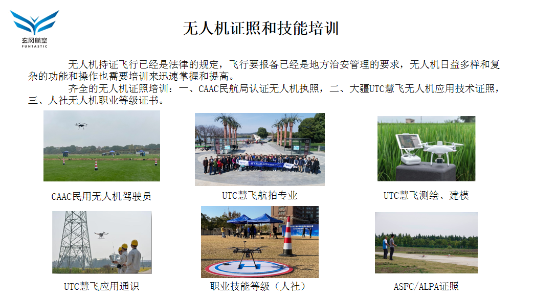 玄风飞培拥有所有无人机培训资质,包括但不限于:CAAC民用无人驾驶航空器驾驶员执照、UTC慧飞无人机应用技术(航拍、测绘建模、行业应用通识等),人社局无人机驾驶员和装调检修工、ASFC航模等级培训、退役军人培训等。