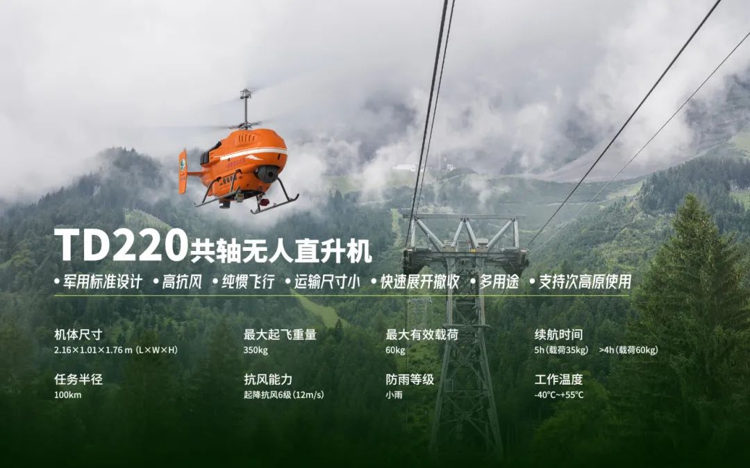作为空中平台,TD220搭载多种任务载荷,获取稳定、清晰的场景视频图像,实现昼/夜及复杂气象条件下,对目标进行搜索、侦察、探测和跟踪;还可以吊挂货物、自动脱钩,进行应急救援。在不同季节的极端气候条件、自然灾害发生时,在复杂山区、高原等不同地形环境的严苛要求下,完成巡检、建模、保障、运输和救援五大任务。
