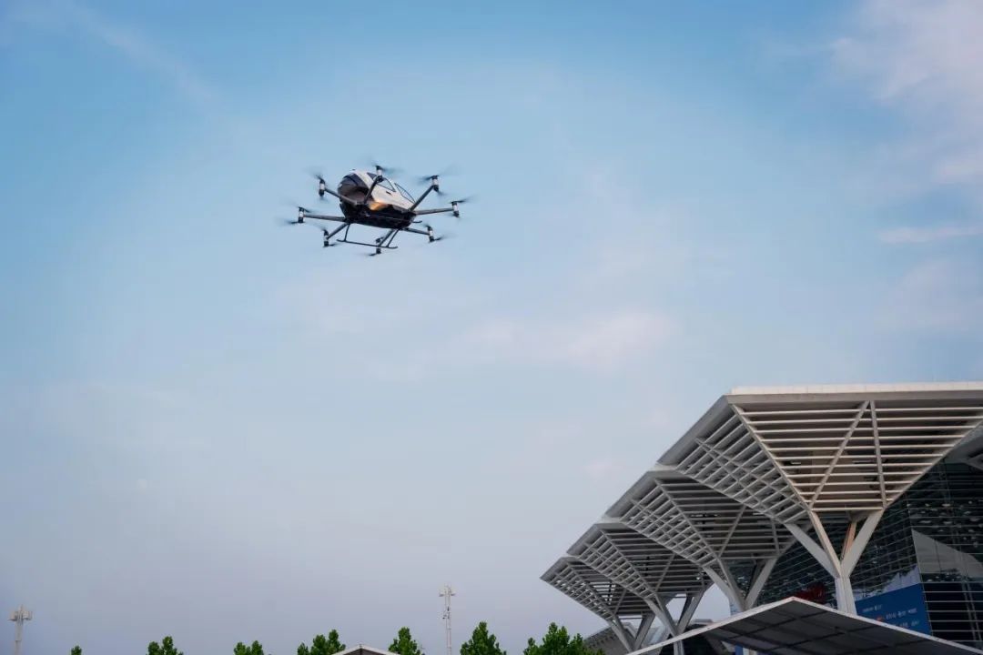 图:亿航EH216-S无人驾驶载人航空器在2024世界智能产业博览会主会场外完成天津首飞