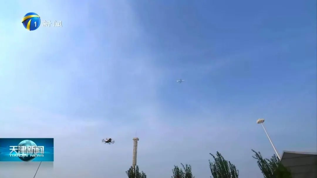 图:亿航EH216-S无人驾驶载人航空器在国家会展中心(天津)的外广场完成天津首飞(天津新闻画面)