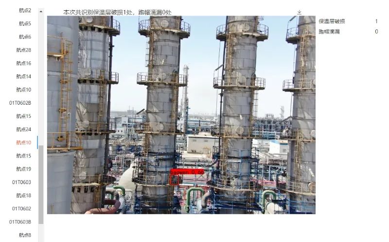 在此次巡检任务中,无人机捕捉到一处保温层的破损,并立即发出报警提示,管理人员掌握具体信息后,及时推进定点维修,预防了可能的生产隐患。