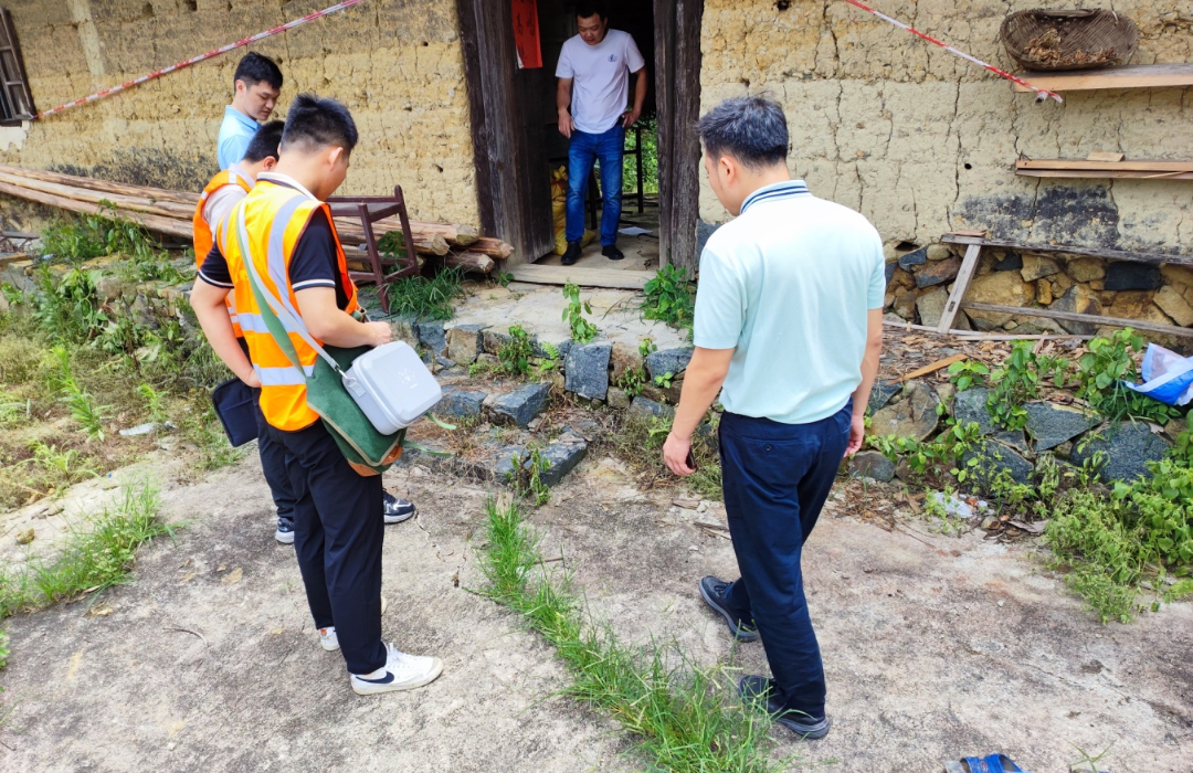 专业技术人员现场查看房屋周边裂缝