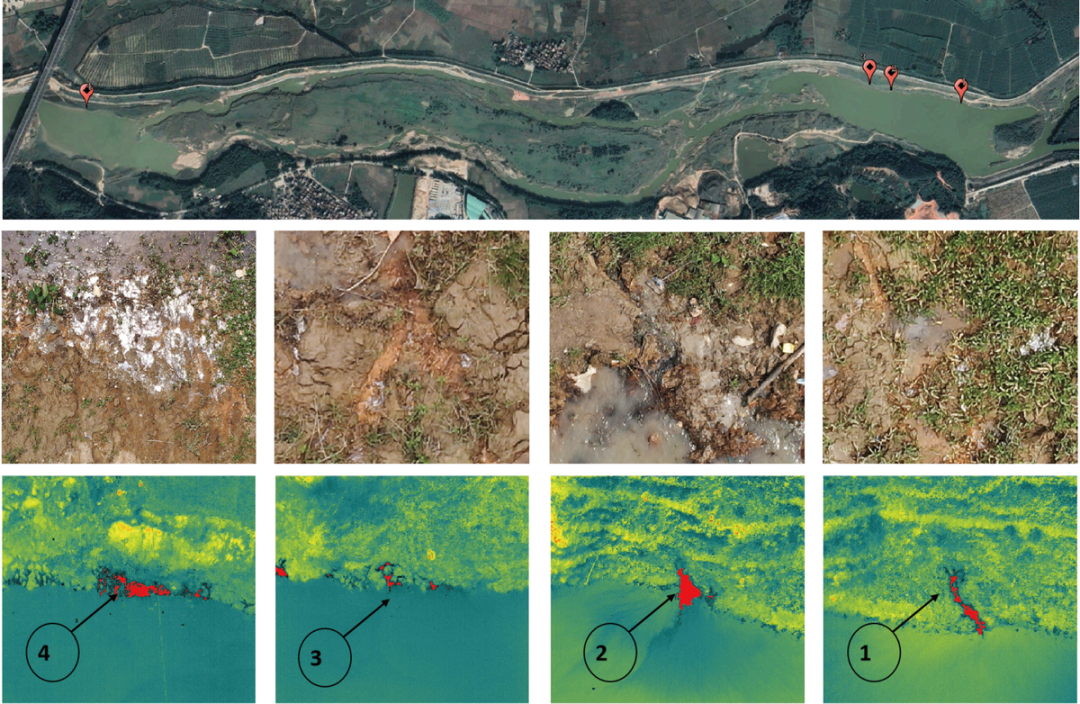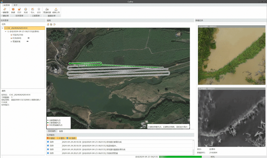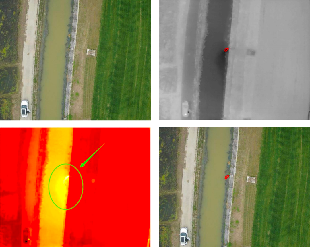 数据采集完成后,使用管涌险情智能识别软件一键解算自动处理并标出管涌点位置;还可快速拼接生成热红外和可见光大图,自动输出管涌风险评估报告,在线推送管涌坐标。