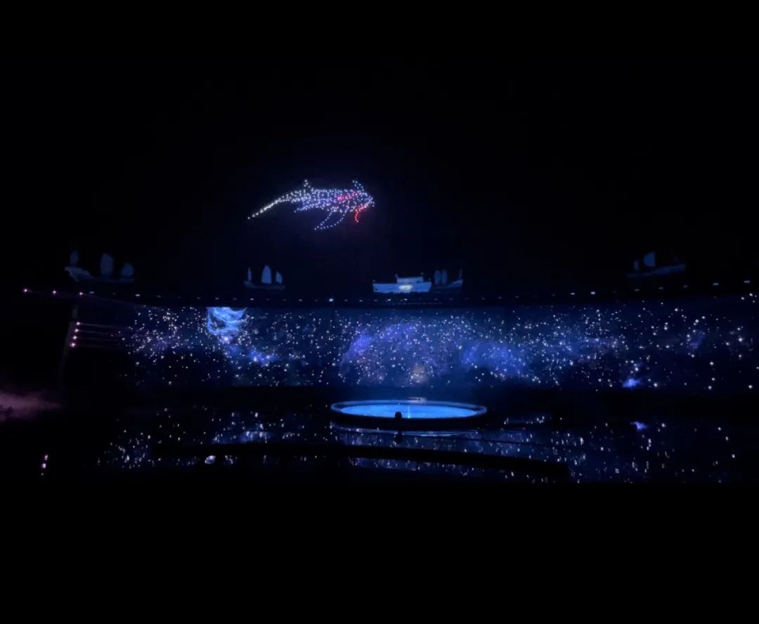 高巨创新无人机编队作为秀演数字化呈现的主要媒介,再一次化身为空中剧场,与舞台的演绎和科技交融,为《海上有青岛》这一史诗巨幕助力。