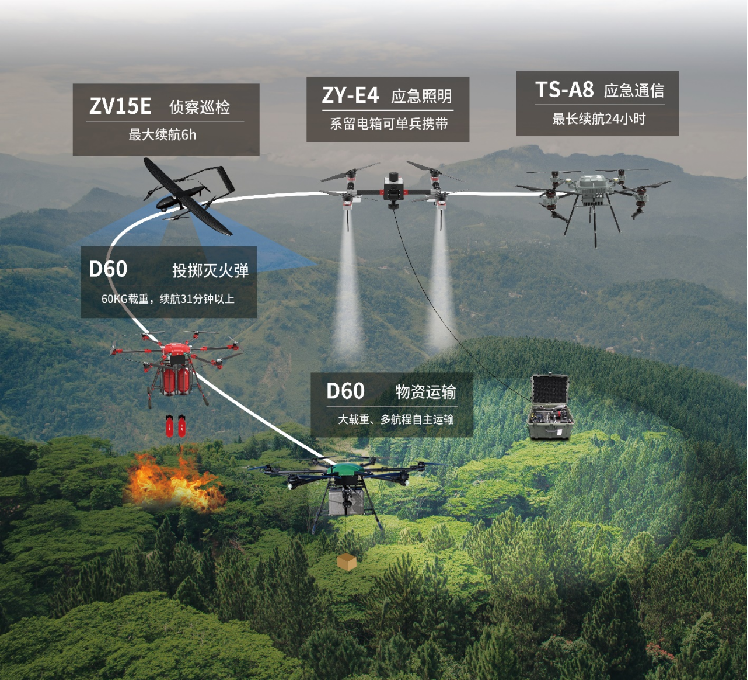 卓翼智能基于应急安全产业痛点难点,提出“无人机+应急救援”的新理念,通过不断拓展和布局应急救援装备板块,加速打造基于无人装备的应急救援解决方案,包括森林防灭火、应急照明、应急通讯和物资投送等,以科技之力助推应急产业提升防灾救灾能力!
