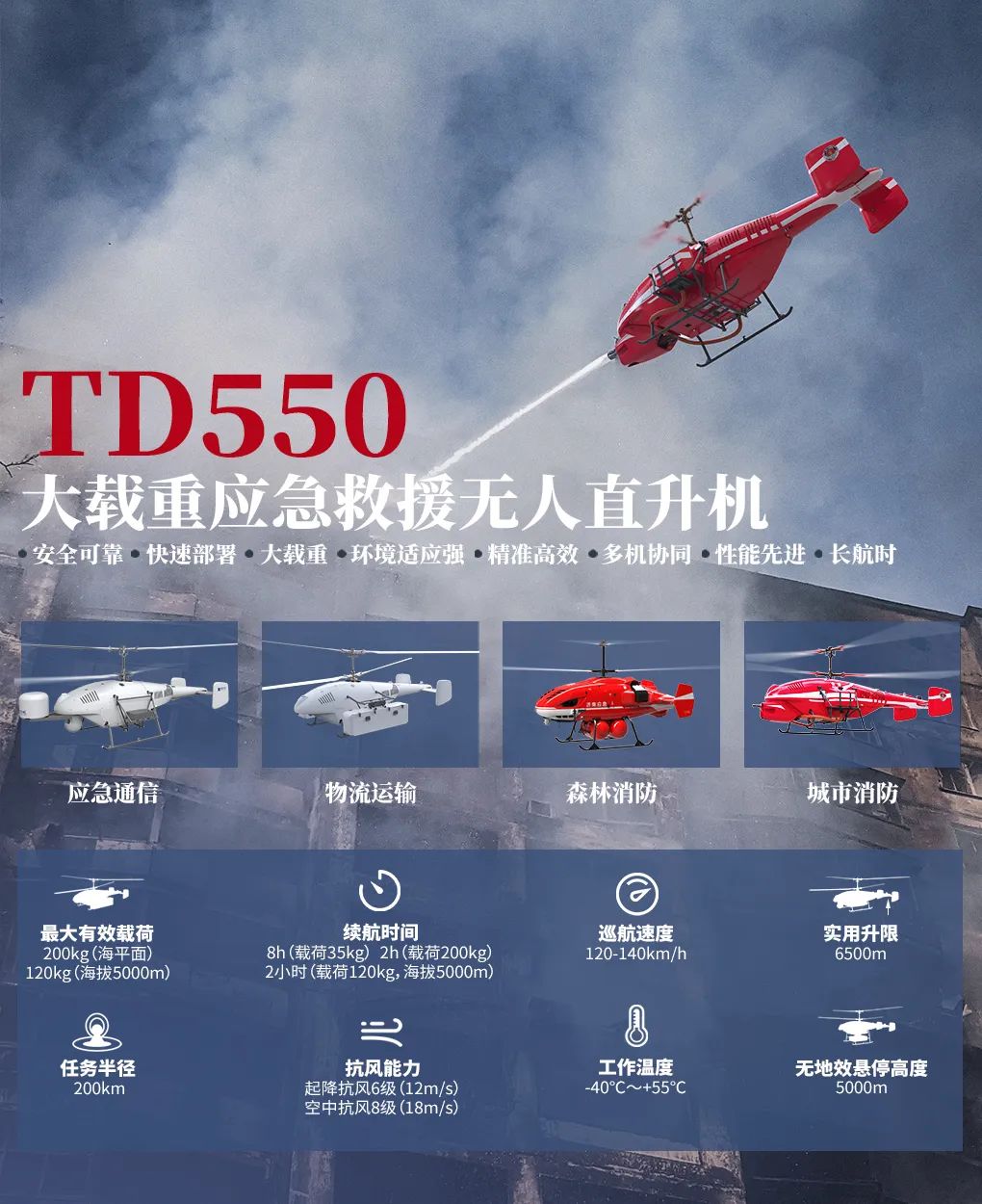 在应急灾害救援中,TD550 已不仅局限于单一领域,其独特的优势和服务能力,在自然灾害、事故救援、公共安全事件等场景中,都展现出强大的应用潜力。TD550已衍生四大产品系列,应急通讯保障型、消防灭火型、救援运投型以及重油版运投无人机,在后勤物资保障、应急运输和电力基建运输等领域具有广泛的应用场景,成为无人系统领域的新标杆。目前,TD550的适航工作也在稳步推进中,各项符合性验证工作也在顺利开展。