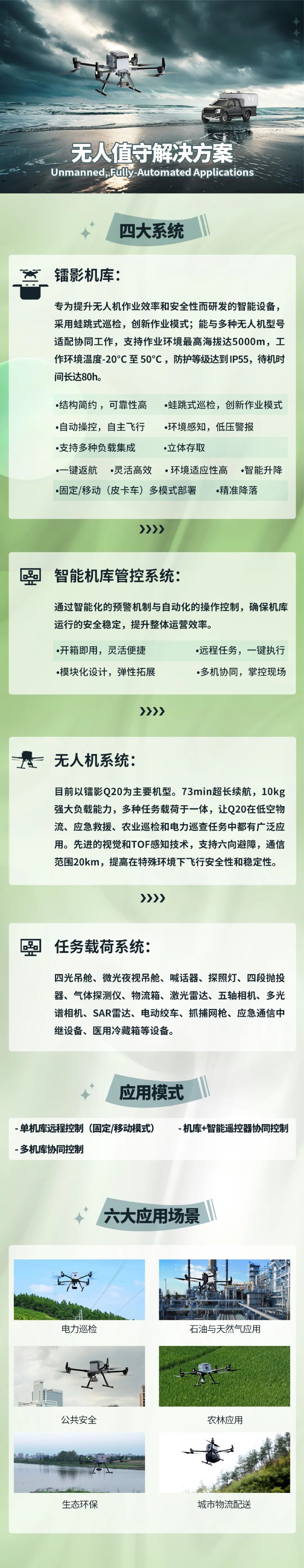 镭影机库协同镭影Q20形成六大场景无人值守解决方案,覆盖输电、变电、配电、发电四个电力巡检全场景,对电力线路和关键设施进行通道巡检、精细化巡检和红外巡检,实现全天候、自动化的作业流程。利用Q20贴近电力设备,多角度巡检,有效解决盲区死角无法观测、巡检频率高、人力和专业性需求高、传统作业长途跋涉等难题,及时发现并处理潜在问题,提高整体电力巡检效率,保障电力供应的安全稳定。立足技术创新和应用模式创新,联合飞机在国际舞台上展示了电网数字化工程的“大国实力”,助力全球电力行业的智能化发展。