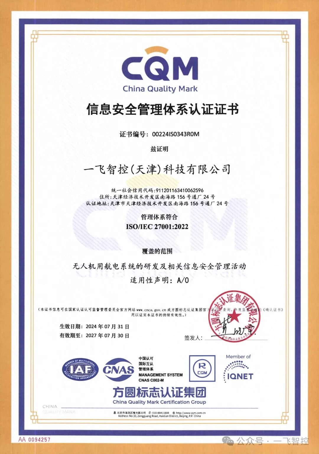 近日,经过权威机构的严格审核和评估,一飞智控(天津)科技有限公司荣获了"信息安全管理体系认证",代表着一飞智控的信息安全管理体系达到了国际先进水平。