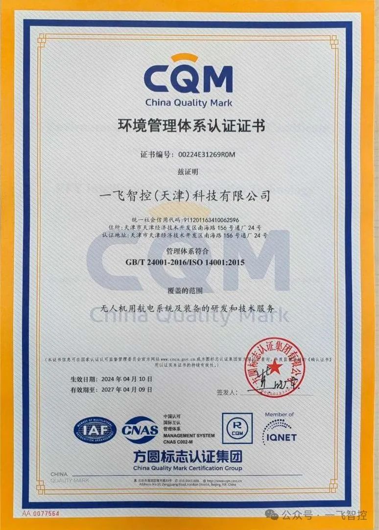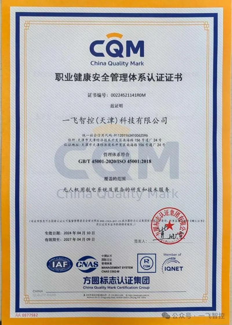 在一飞智控的发展历程中,始终致力于构建全面、高效、可靠的管理体系,秉持高标准严要求,从战略规划、组织架构、流程管理、公司的规范化经营、质量把控、社会责任践行等多方面来展开工作,获得了专家考察团队的高度认可。并最终顺利通过全球公认的黄金标准-三体系认证(ISO 9001质量管理体系、ISO 14001环境管理体系、ISO 45001职业健康安全管理体系),彰显了一飞在企业管理体系上的专业性和成熟度。
