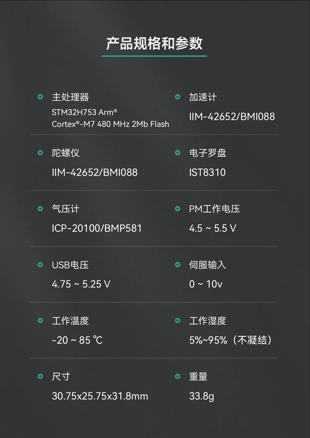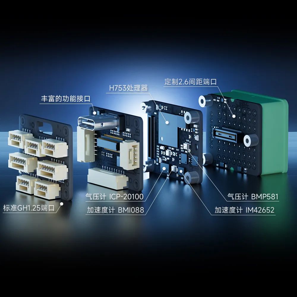 内置 STM32H753 高速处理器,支持安全启动和安全固件升级服务。480Mhz 双精度浮点运算单元搭配2M Flash 内存空间,兼容 PX4 和 ArduPilot的完整驱动和功能(比如IMU温度学习、非 GPS 导航、FFT滤波算法和 LUA 脚本等)并为后续开发和新驱动提供充足的空间。