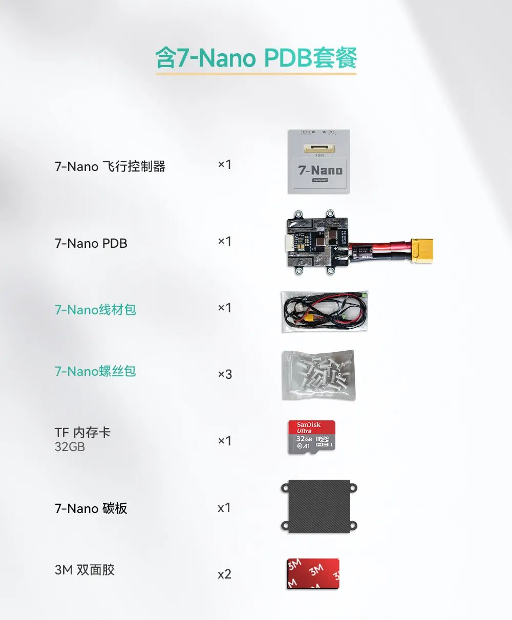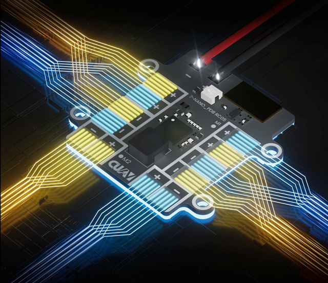7-Nano 可选配 PDB 分线板,7-Nano PDB分线板集成电压、电流检测和电源分配功能,可支持70V 电压(3~16S)输入和 60A 电流检测以及六组电源分配功能。出厂预校准,用户无须进行校准操作即可获得较好的电压及电流检测精度。