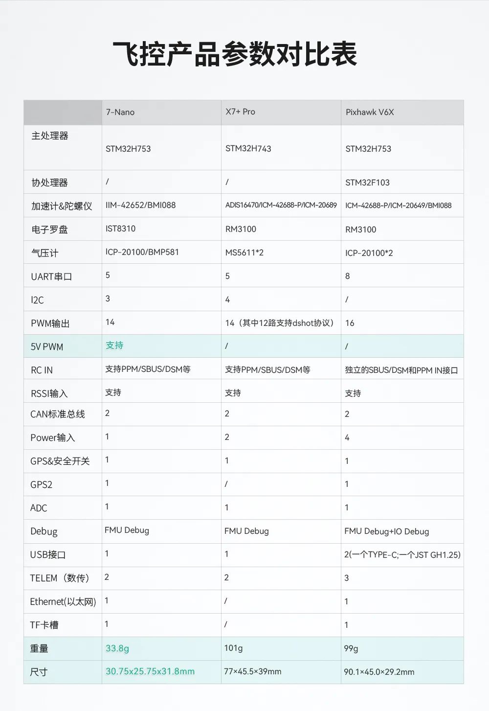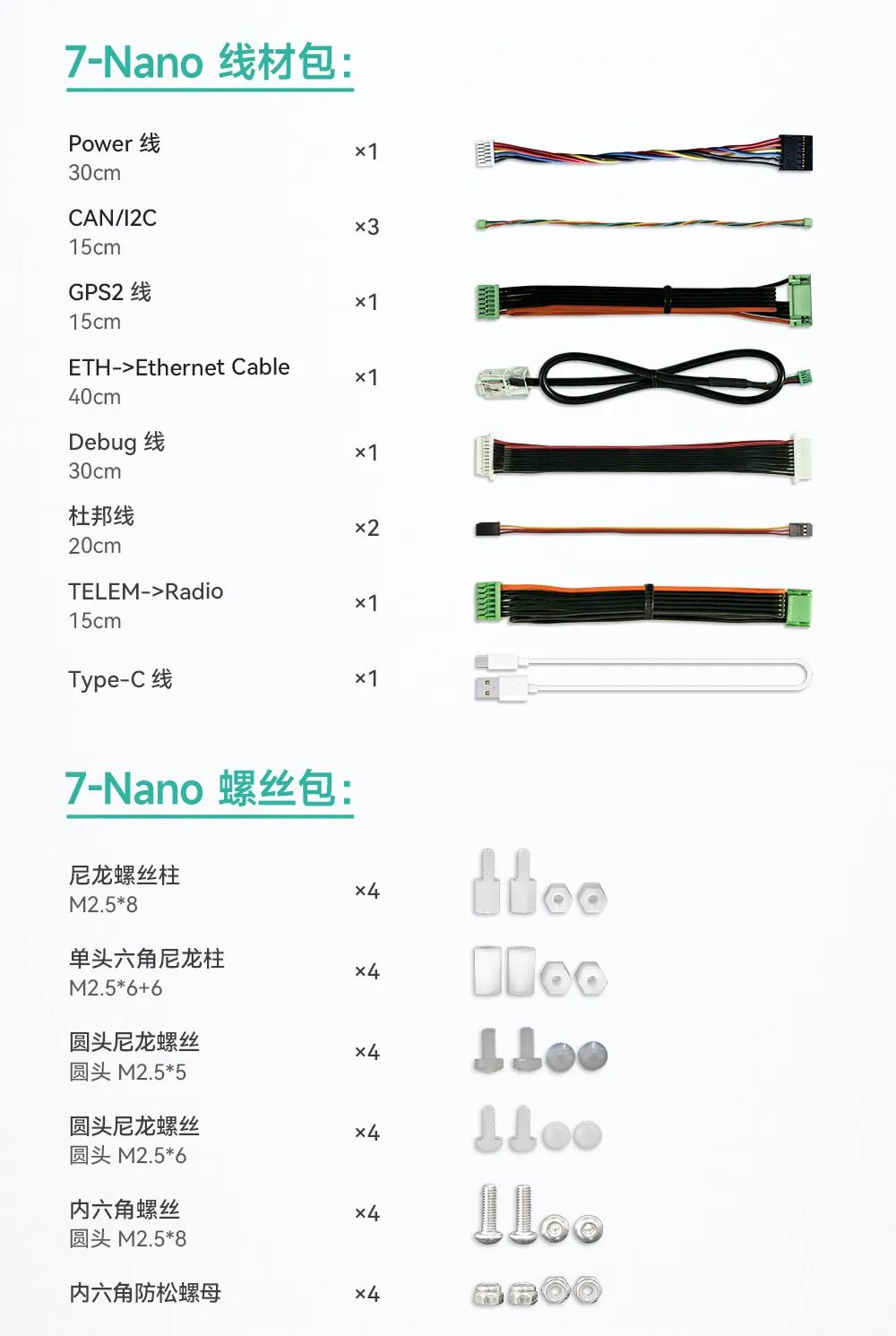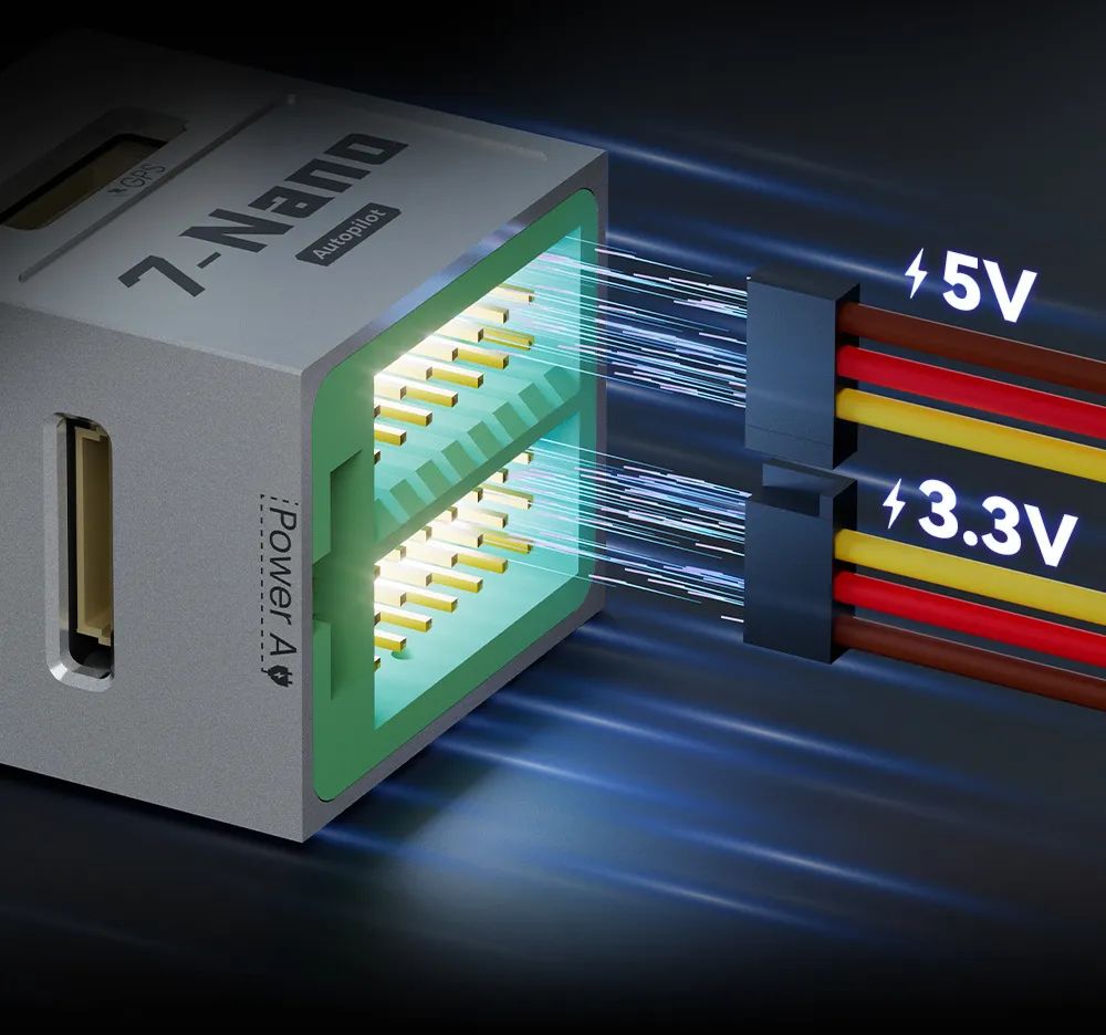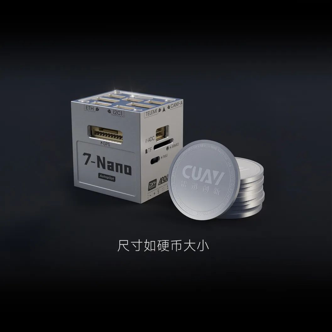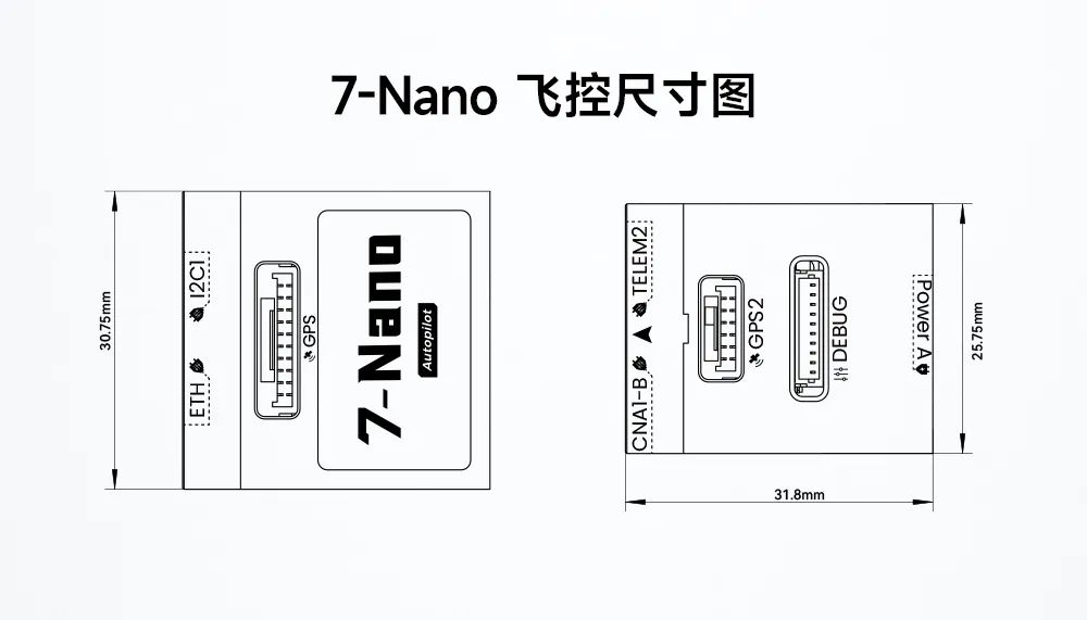 7-Nano 采用高集成度叠层设计。它的尺寸如硬币大小,重量仅33.8g,精致小巧,结构紧凑,可以轻松装入 FPV机型或者微型共桨直升机等空间紧凑的机型中。同时具有丰富的功能接口,侧边出线,安装方便,能满足大部分的扩展需求。