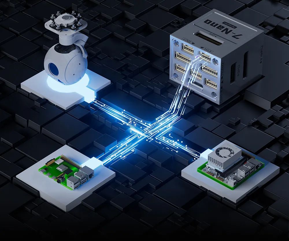 集成以太网 PHY 接口,支持以太网扩展机载计算机、光学吊舱和数据链路等,可为无人机蜂群作业、视觉导航与跟踪等智能 AI 应用提供高实时性、大带宽通信保障。
