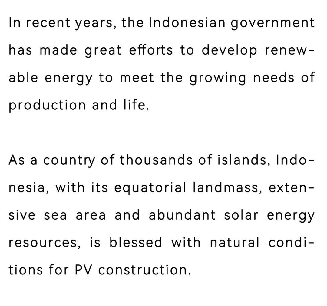近年来,印尼政府大力发展可再生能源,用以满足不断增长的生产生活需要。作为一个“千岛之国”,印尼地跨赤道,海域面积广,太阳能资源丰富,在光伏建设方面拥有得天独厚的自然条件。