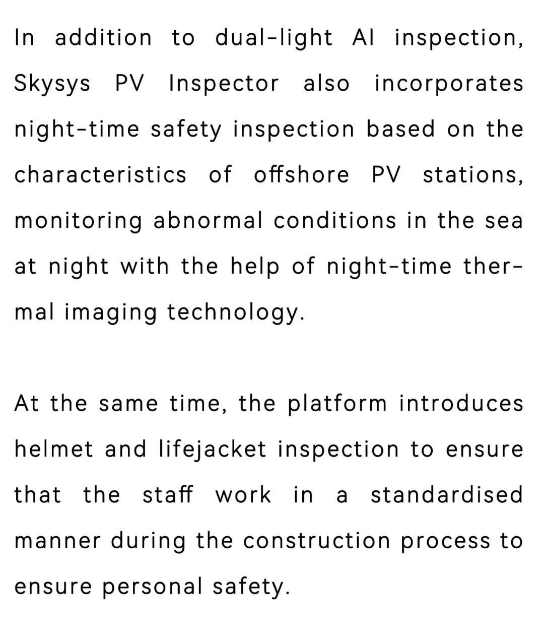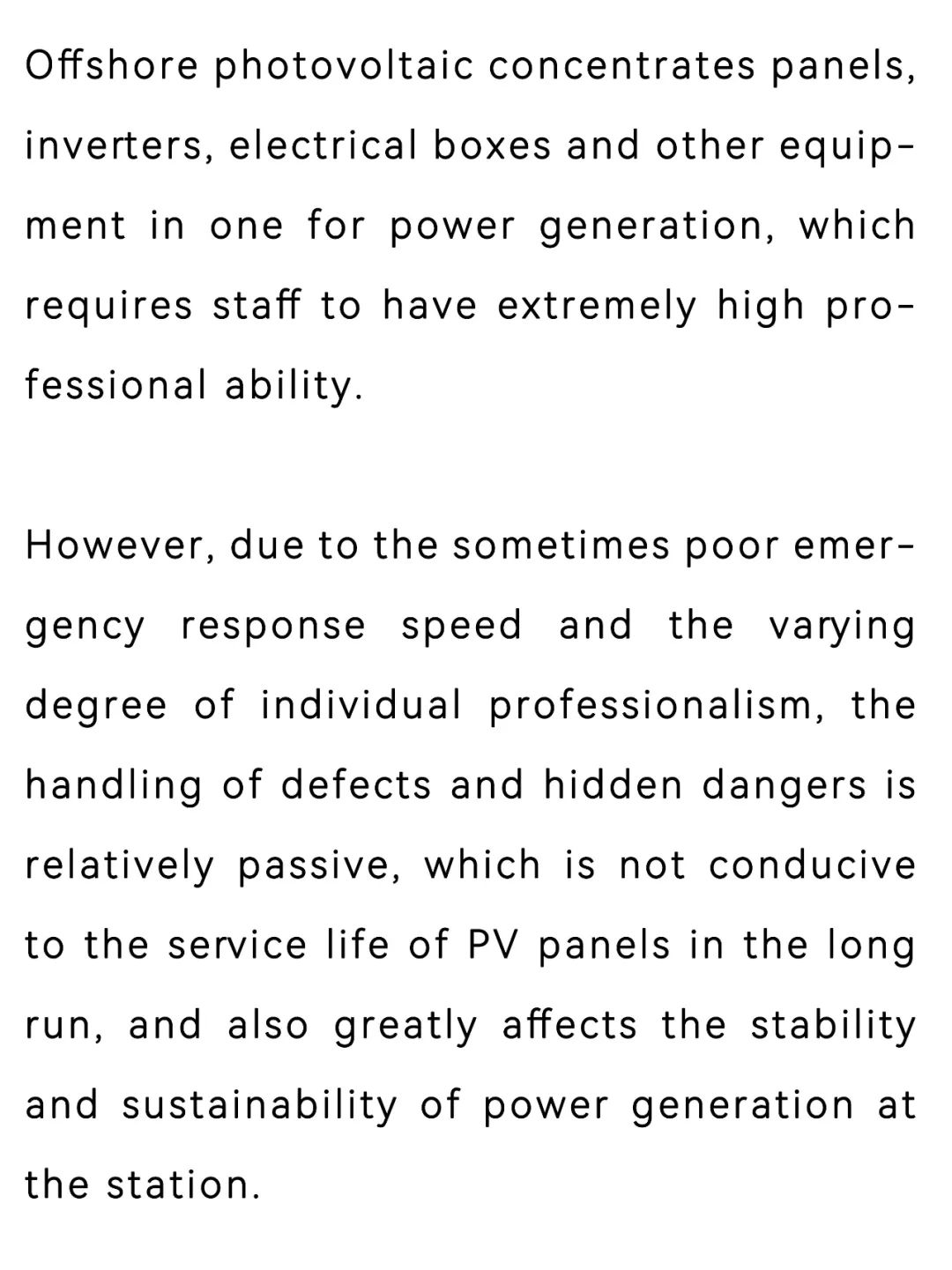 ·海上光伏集中了面板、逆变器、电箱等设备于一体进行发电,这要求工作人员具备极高的专业能力。但由于应急响应速度有时差,个体专业程度不一,对缺陷隐患的处理较为被动,长此以往不利于光伏板的使用寿命,也极大影响着场站发电的稳定性和可持续性。