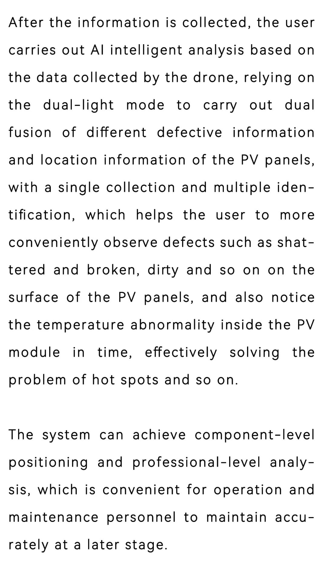 信息采集完毕后,用户根据无人机采集的数据进行AI智能分析,依托双光模式对光伏板的不同缺陷信息及位置信息进行双融合,一次采集,多重识别,帮助用户更为方便地观察到光伏板表面的碎裂破损、脏污等缺陷,也能及时注意到光伏组件内部的温度异常,有效解决热斑等问题,组件级定位,专业级分析,方便运维人员后期精准维护。