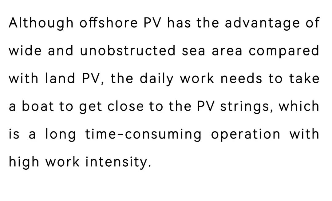·海上光伏相比陆地光伏虽然拥有海域宽阔、无遮挡的优势,但日常工作需乘船才能靠近光伏组串,作业耗时长、工作强度大。