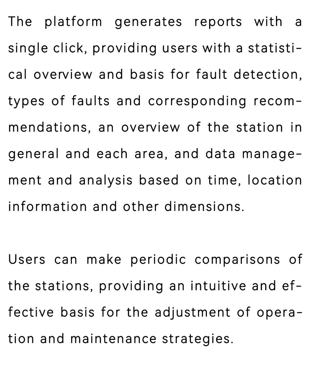 平台一键生成报告,为用户提供故障检测的统计概述与依据,故障类型及相应建议,场站总体与各个区域的概况等内容,并基于时间、位置信息等多个维度进行数据管理与分析,用户基于此对光伏场站进行周期性比对,为运维策略的调整提供直观有效的依据。