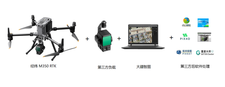 无人机摄影测量系统解决方案主要有三个部分组成:测绘无人机、测绘无人机负载平台、数据采集以及处理软件。