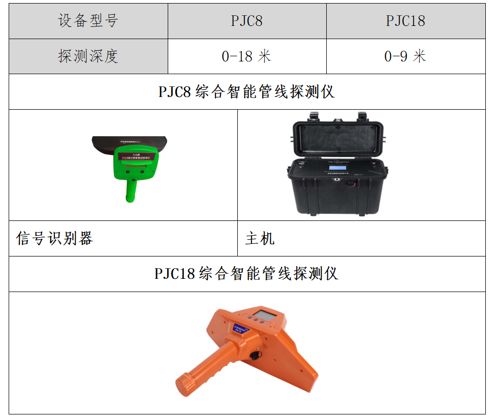 PJC系列(PJC8、PJC18)综合智能管线探测仪可在不开挖地面土方情况下,快速精准地探测各类材质的燃气、输水、电力、光缆等埋地金属及非金属管线;确认管道位置、埋深、走向以及管径;可探测管道管顶管底埋深;同一区域内不同分层管道铺设信息;通过管道事先探测后可避免因城市埋地管线不明造成第三方开挖作业风险;还可用于寻找偷盗燃气、原油、自来水隐藏支管,保障人民财产安全;设备能重点协助业主解决无示踪线,无图纸、埋深0~18米内老旧埋地燃气、自来水、光缆、电缆等金属及非金属管线历史遗留问题。