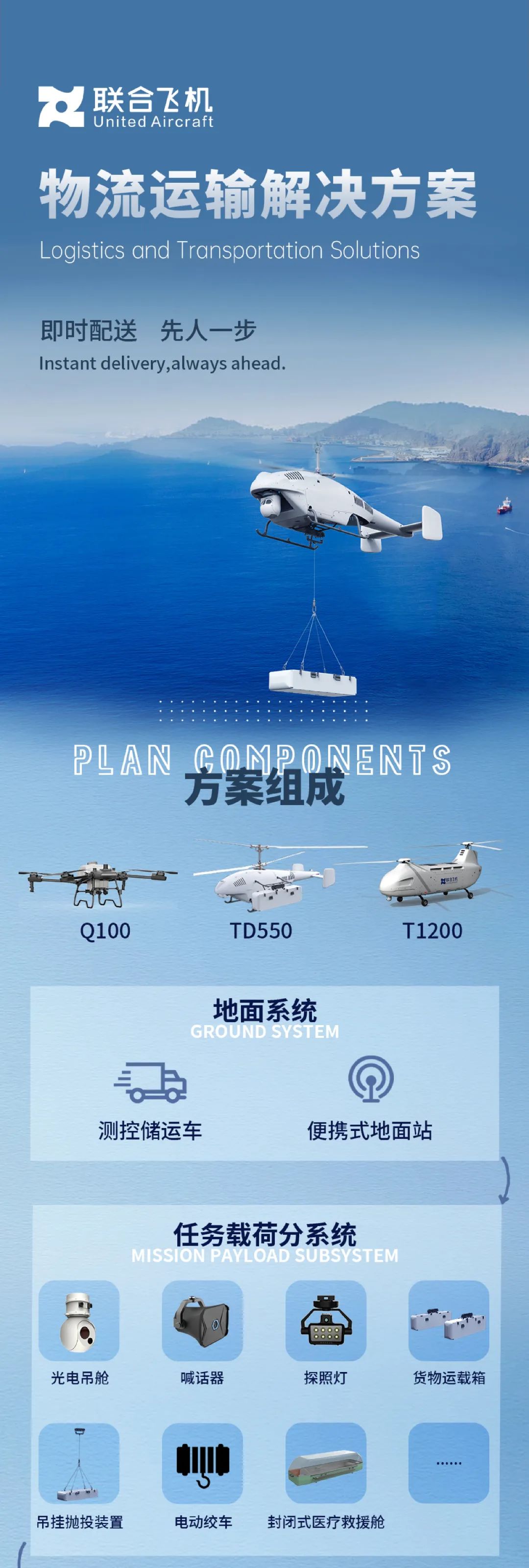 案例1:高海拔地区的精准速递 在我国西部的边陲哨所与偏远村落,这两款运投无人机系统解决方案展现出了超凡应用能力。全新研发的T1200 以6500米的升限与500公斤的最大载荷,突破地理障碍,从最近的补给点、附近县域、通行公路或机场腾空而起,跨越高耸的雪山,将新鲜食材、医疗用品等生活必需品及关键生产物资精准送达目的地。 无论是夏日雨水肆虐导致的道路损毁,还是冬日严寒下道路的冰封雪覆,它们都能稳健前行,确保当地居民与驻守人员的基本生活与生产需求得到满足。 案例2:海岛及海上平台的补给线 东部沿海地区,台风季的狂风、骤雨、巨浪对海岛与海上作业平台构成严峻挑战,给海岛礁盘上的哨所与海上作业的渔民面临物资补给的巨大困难。 由于小型无人机抗风能力较弱,难以在复杂气象环境下起降作业,无法胜任物资运输补给工作。TD550与T1200无人机凭借其卓越的抗风性能与稳定性,成为孤岛守望者与海上渔民的坚强后盾。 它们穿梭于波涛之间,将生活必需品、燃料储备及渔业生产工具等关键物资迅速送达,确保了海防安全与渔民的生产生活连续性,成为极端天气下不可或缺的物流通道。 场景三 / 应急救援与物资运投 面对泥石流、地震引发的地面交通瘫痪,洪水、大雪围困的严峻局势,传统地面救援手段因交通中断而受限,同时移动通信与电力供应亦面临中断风险。加之恶劣多变的天气条件,如持续降雨、强风、泥石流频发及大雪封路,进一步加剧了救援难度。 紧急时刻,联合飞机运投型无人直升机以其独特的空中点对点运输能力,成为突破困境的关键。它们能够无视地面障碍,迅速穿越复杂环境,直接将急需的日常生活物资、医疗援助、救灾装备等精准送达受困区域,有效保障了受灾民众的基本生存需求与紧急医疗救治,极大提升了救援效率与响应速度,成为公共应急体系中的明星方案。 案例1:灾区救援设备和物资的精准运投 大载重无人机TD550 和 T1200 凭借其卓越的环境适应性和强大的飞行能力,在恶劣天气下依然稳定作业,成功克服地面无合适降落场地的难题,可将救援物资及时送到被困人员手上。在2023年京津冀地区特别是北京门头沟区遭遇的严重洪涝灾害中,TD550利用其卓越的悬停技术,在空中精确投放数百公斤的饮用水与食物,直达受困村庄,为受灾群众送去了生命的希望,展现了无人机在极端条件下的非凡救援能力。 案例2:紧急医疗转运与空中生命通道 针对偏远或重灾区伤员及危重病人的紧急救治需求,T1200无人机化身为“空中救护车”,不仅装备了双光吊舱、通讯设备及照明工具,确保与被困人员的有效沟通;还能通过创新的信息传递方式,如对讲装置、录音留言、书写纸条等,精准收集救援需求,为外部救援团队提供实时信息支持。特别是T1200,其舱内集成了全套医疗急救设备,包括担架、吸氧机、输液系统及生命体征监测仪,并可直接搭载医护人员,实现空中紧急医疗救护与转运,为病患争取到宝贵的救治时间,在地震、火灾等突发事件中将发挥不可替代的作用。 场景四 / 电力设备运投 在电力设备投送领域,无人机技术正展现出前所未有的应用潜力,特别是在复杂地形,如山区、高原地区,输电线路构建与发电场建设所需的塔材、沙石水泥、光伏面板等物资的运投,输电线路故障情况下维修材料和检修工具的运输,无人机已成为关键物资运输的革新力量。 案例1:电力基建运输 2024年3月,联合飞机大载重无人机TD550成功参与浙江省电力运投项目,于安吉县崎岖山区每日执行三架次飞行任务,高效运输数百公斤重的塔材设备至山顶,实现精准空投,不仅破解了地形限制下的运输难题,还极大地降低了人员安全风险,显著提升了运输作业的整体效率。 案例2:电力应急运输 面对南方地区特有的冻雨灾害挑战,TD550无人机更是展现出其多功能性,不仅胜任日常线路巡检任务,及时发现并报告输电线路异常,还在灾害应急响应中扮演了关键角色。它能够快速吊运维修所需工具和零部件至维修人员手中,甚至包括电动绞车等重型设备,有效弥补了地面交通受阻时维修效率低下的困境,确保了电网的稳定运行与快速恢复。 针对输电线路突发故障情况,无人机不仅负责迅速运输维修材料和检修工具,更在缩短应急响应时间、确保维修效率方面发挥了重要作用。这一系列创新应用,标志着无人机技术在电力设备运维领域的深度融合与高效实践,未来,联合飞机研发的更大载重、更长航时、更高速度的1.2吨级无人直升机将为电力运投场景贡献更大价值。 场景五 / 野外勘探运输 在野外勘探与科考运输领域,无人机技术正逐步成为不可或缺的解决方案。面对地形复杂多变的山区及高海拔地区,传统运输方式在车辆难以触及的区域显得力不从心,尤其是重型设备部件的搬运,无论是人工背负还是多人协作,均难以在地势险峻或植被茂密的自然环境中高效通行。 自2022年起,联合飞机 TD220与TD550以其载重能力大、可垂直起降和长时间悬停,并具有较强的抗风能力和防雨能力,能够在较为复杂的气象环境下正常飞行等独特的空中优势,实现了设备部件的精准点对点投送,不仅极大地提升了运输效率,还确保了仪器设备在运输过程中的安全无损,相继在西部地区石油勘探项目中大显身手。 在应对道路不通、地形复杂的挑战、恶劣气候环境条件时,TD550 展现出卓越的环境适应